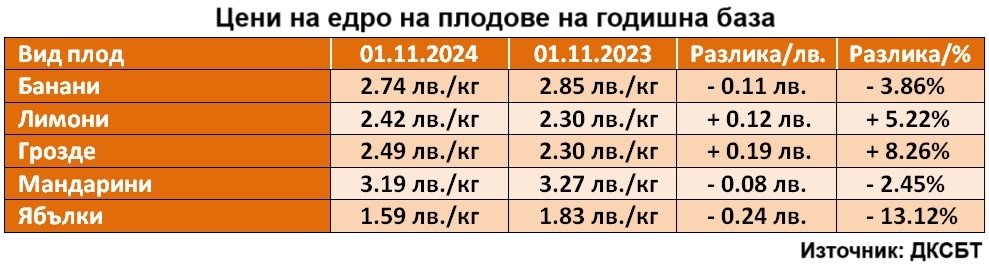 От таблицата по-горе е видно, че на годишна база поевтинелите са повече от поскъпналите. Най-много е спаднала цената на бананите (-0.36 лева), следвани от портокалите (-0.20 лева), ябълките (-0.03 лева), поскъпнали са само лимоните (+0.03 лева).