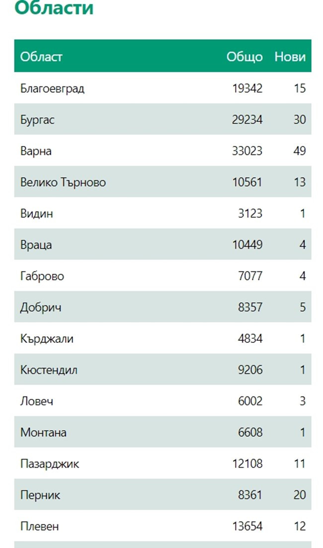 В Благоевград новозаразените са 15, в Бургас - 30, Варна - 49, Велико Търново - 13, Видин - 1, Враца - 4, Габрово - 4, Добрич - 5, Кърджали - 1,