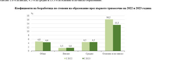 Това сочат данните на Националния статистически институт (НСИ). 12.4 процента от безработните са с висше образование, 57.7% - със средно, и 30.0% - с основно или по-ниско образование. Коефициентите на безработица по степени на образование са съответно 1.6% за висше, 4.5% за средно и 13.3% за основно и по-ниско образование.