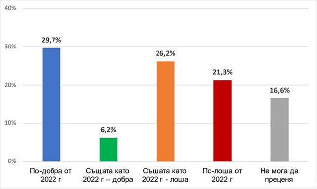 54% от българите дават негативна прогноза за това каква ще бъде Новата 2023 година за света. 29% от тях очакват тя да е толкова лоша, колкото 2022 г., а 25% се опасяват, че Новата 2023 г. може да е и по-лоша от 2022 г.