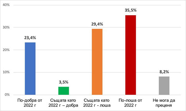 Най-много са песимистите относно това каква ще бъде Новата година за България. 65% от интервюираните декларират негативни очаквания. Според 36% от тях, 2023 г. ще е по-лоша от 2022 г., а според 29%, 2023г. ще е толкова лоша, колкото е 2022г. Песимисти за 2023 г. са по-често хора с нисък стандарт на живот, роми и жители на градовете-областни центрове, а оптимисти-младите хора и столичаните. Оптимистите за бъдещето на страната ни са намалели двойно за последната година.