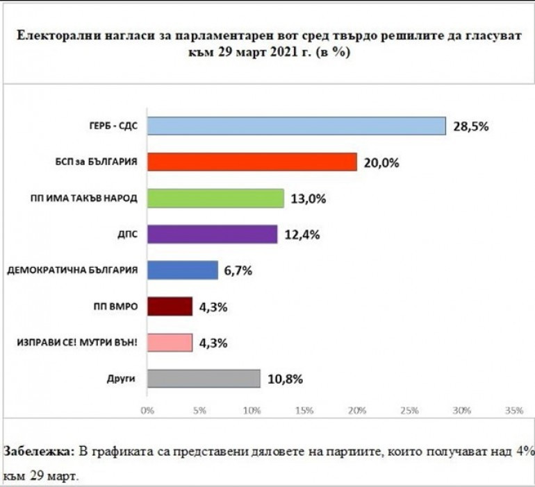 ГЕРБ печели 28,5% от гласовете, срещу 20% за БСП. „Има такъв народ“ – 13 на сто, ДПС – 12.4 на сто. „Демократична България“ – 6.7 на сто, ВМРО – 4.3 на сто, „Изправи се! Мутри вън!“ /ИМВ/ – 4.3 процента.