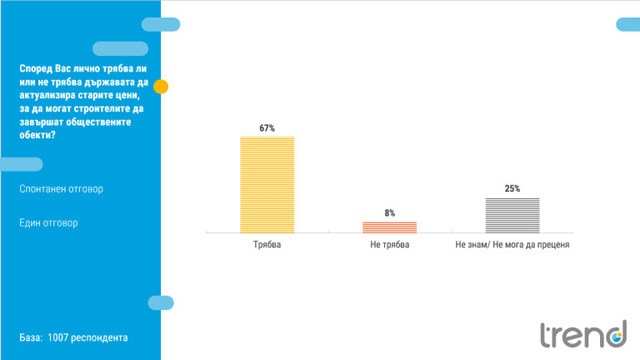 67% от българите са на мнение, че държавата трябва да актуализира старите цени за възложените обществени поръчки, за да могат строителите да завършат обектите, 8% не са съгласни. Младежите във възрастова група 18-29 г. в най-голям дял не знаят какво трябва да се направи в тази ситуация.
