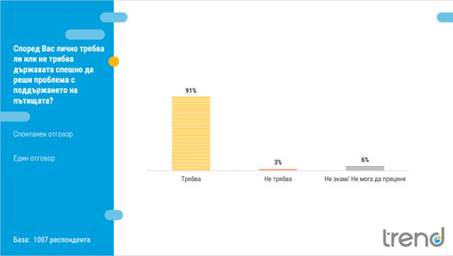 91% от българите смятат, че държавата трябва спешно да реши проблема с поддържането на пътищата.