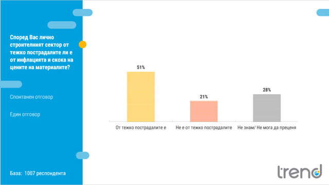 51% от хората считат, че строителният бранш е сред сериозно засегнатите от инфлацията и скока на цените на материалите. 21% не споделят това мнение, а 28% не могат да преценят.