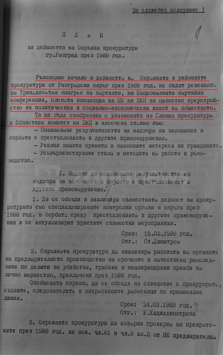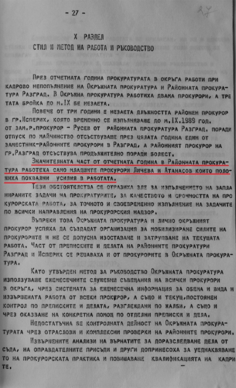 Край на цитата. Какво ни казва това изречение? Разкрива ни две неща - че през годината на пика на "Възродителния процес", в Районната прокуратура в Разград са работили като обвинители само двама души - младшите прокурори Личева и Атанасов. И второ - толкова са се старали, че са заслужили похвала заради своето усърдие. Тоест, всичко, с което са се занимавали е било в изпълнение на указанията на Тринадесетия конгрес на БКП, на Националната партийна конференция, Юлската концепция на ЦК на БКП и следвайки в работата си на обвинители указанията на Областния комитет на БКП-Разград.