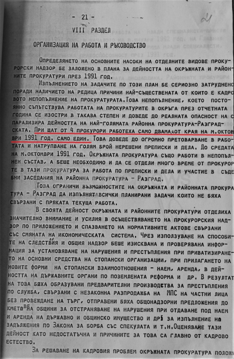 "Значителна част от отчетната година в Районната прокуратура работеха само младшите прокурори Личева и Атанасов, които положиха похвални усилия в работата".