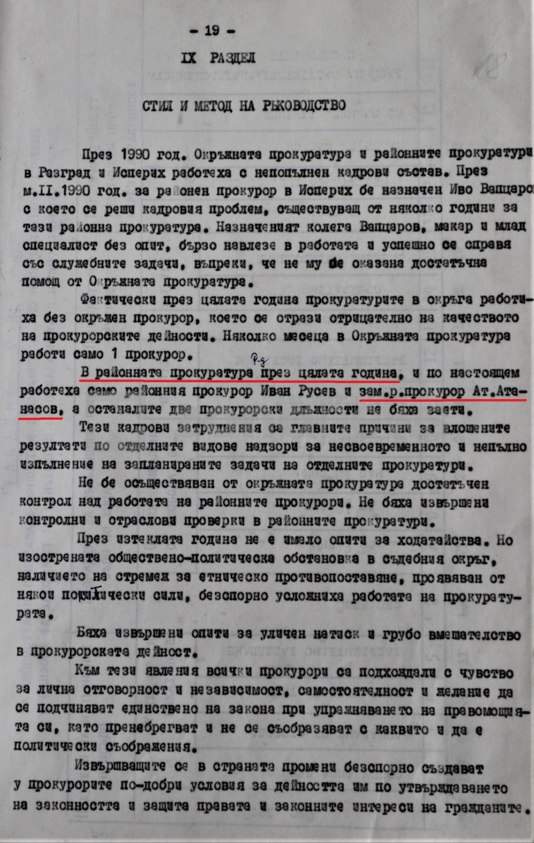 Така ще бъде и в този мой материал - започваме с документ и ще завършим с документ от Държавен архив-Разград. Там има доста масиви, в които протича името на Атанас Атанасов в амплоато му на районен прокурор. Ето, виждате обобщаващ доклад за работата на Районната прокуратура в Разград за 1989 г. Там е написано дословно следното: