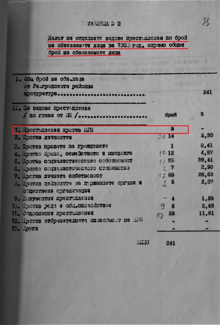 В отчет за работата на Районната прокуратура-Разград за 1989 г., в Таблица № 2, ясно се вижда, че през годината Районната прокуратура е повдигнала 9 (девет) обвинения за престъпления против НРБ. Какво означава това? Текстове от Наказателния кодекс, по които най-често са обвинявани политическите противници на комунистическия режим, са по чл. 96 (Глава "Престъпления срещу Народна република България") и още няколко члена. От този документ е очевидно и 100 процента доказано, че Районната прокуратура в Разград е подготвяла и такива обвинения. Изводите си ги правете сами - вие, които четете това убийствено за бъдещата политическа кариера на Атанас Атанасов и ментетата от ДеБъ разследване. На вас остава единствено да разпространявате фактите и документите от него.