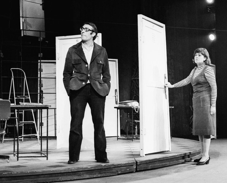 10 януари 1980 г. Светослав Пеев в сцена от пиесата "Сако от велур" от Станислав Стратиев. Снимка: Петър Жеков/БТА