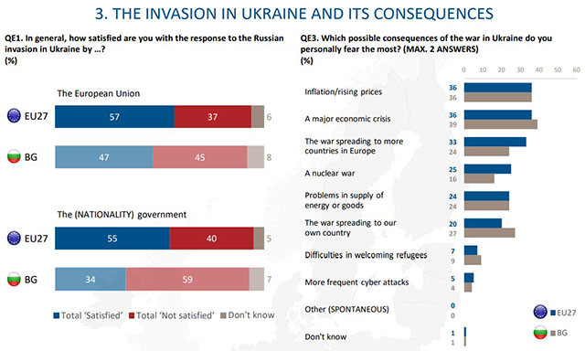 Според българите най-важните задачи пред ЕС са свързани с международната обстановка (34 на сто), високите цени (31 на сто) и доставките на енергия (26 на сто). В останалата част от ЕС най-голяма тревога будят високите цени (34 на сто), енергийните доставки и международната обстановка (по 28 на сто).
