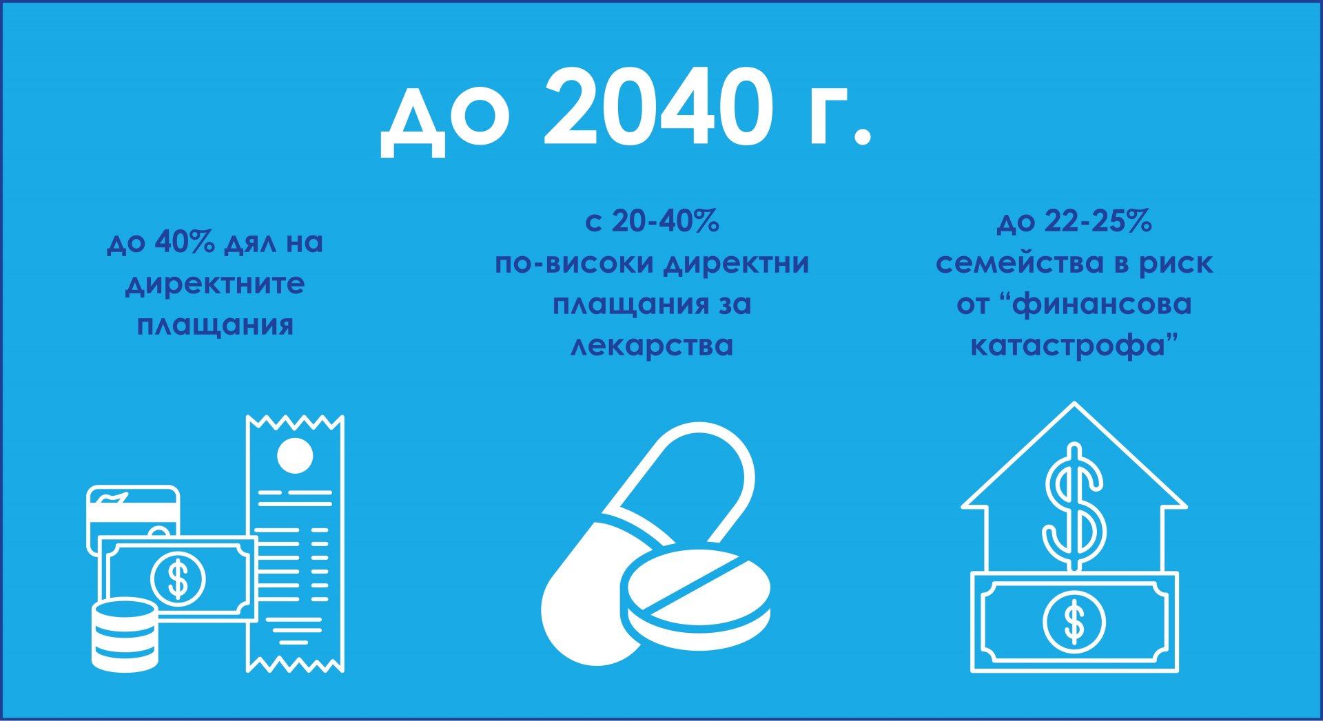 Прогнозата на Health Metrics обаче показва влошаване на тази тенденция - до 2040 г. директните плащания могат да достигнат 40% от общите разходи за здраве, а разходите само за лекарства да скочат с до 40%. Това поставя хиляди български семейства в риск от т.нар. "финансова катастрофа" - ситуация, при която плащането за лечение изтласква домакинството под прага на бедността.