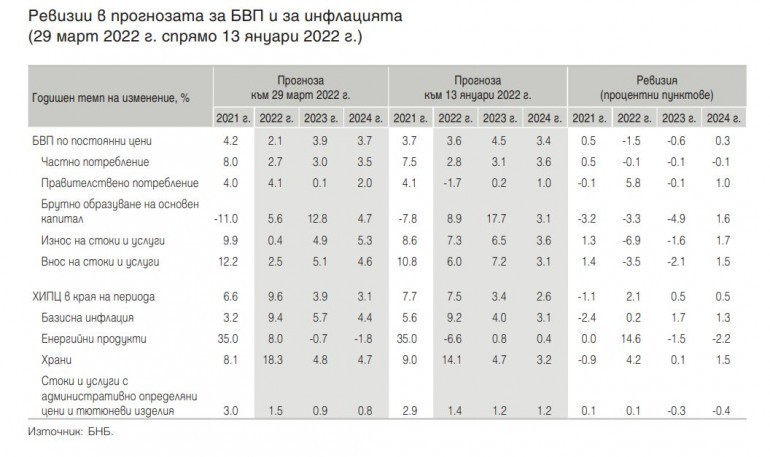 Базисният сценарий на БНБ предвижда ръстът на брутния вътрешен продукт (БВП) на страната през 2022 г. да се забави до 2,1%, при очакван ръст от 3,7% в предишната прогноза от декември. По-малкият ръст на икономиката ще се дължи на по-малко увеличение на потреблението и на свиване на износа, обясняват специалистите.