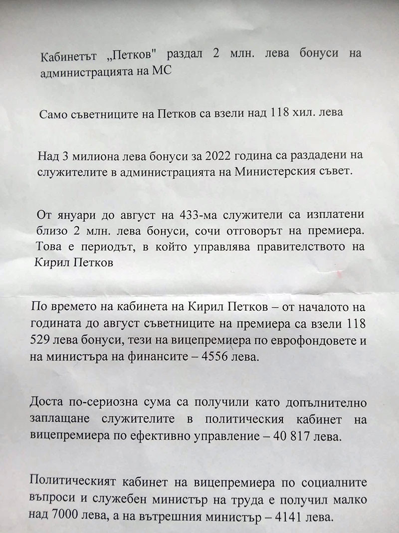 Видно от справката, която е направил Борисов, кабинетът на Кирил Петков е раздавал не по-малко бонуси. Само съветниците на Петков тогава са получили над 118 хиляди лева.