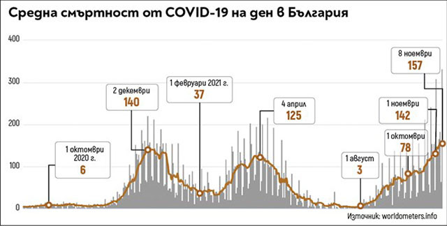 Увеличение на смъртността от коронавируса с 11% до 157 души средно на ден показва статистиката за последните седем дни. Във вторник бяха отчетени шокиращите 334 жертви, което е най-високата бройка от началото на епидемията у нас. Данните във вторник обаче са с натрупване на случаи от събота и неделя, които не са били вкарани в системата навреме. Ако добавим към 334 починалите от събота и неделя - съответно 65, и 69, получаваме 468 или средно по 156 за трите дни.