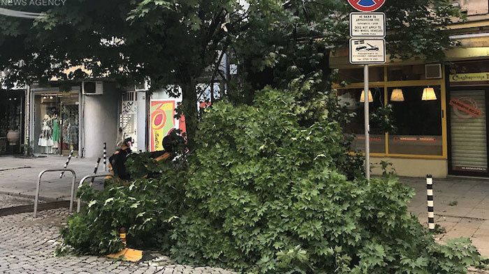 Голям клон от дърво падна в центъра на София след силния дъжд, изсипал се в събота вечер над централните и южни части на града. Имаше и градушка на места, предаде репортер на БГНЕС.