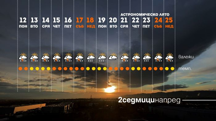 На 21 юни, в последната пълна седмица на месеца, ще посрещнем астрономическото лято. Първата половина на периода ще е по-спокойна - с високи дневни температури - около и малко над 30 градуса и оскъдни валежи.