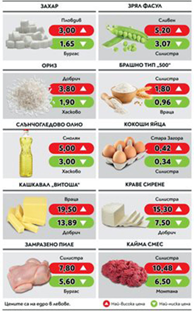 Например кашкавалът е поевтинял с 6 стотинки по цени на едро за седмица, но средната му цена за България е 18,04 лв., а не липсват и градове, в които го продават срещу 19,50 лв., като в Сливен. (Виж инфографиката.)