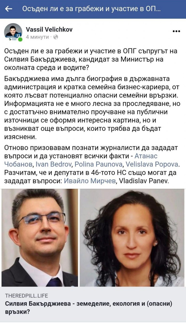 Бърза справка в мрежата около името на Силвия Бакърджиева води до сайта „theredpill.life“, където има подробна статия за семейство Бакърджиеви, подписана от Величков. В нея той разкрива, че съпругът на кандидат-министърката е бил осъждан, или поне така излиза когато името на Живомир Тодоров Бакърджиев бъде потърсено.