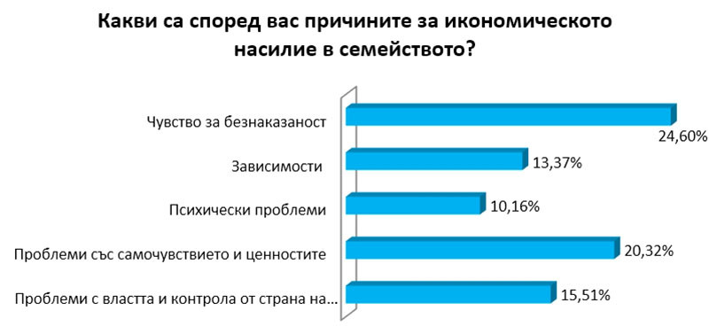 Основна причина за икономическото насилие в семейството, изследваните лица смятат, че е чувството за безнаказаност – 24%. Този резултат се обяснява с изключително трудното доказване на този вид домашно насилие и недостатъчно доброто разпознаване на формите му на проява. 20% от запитаните смятат, проблемите със самочувствието и ценностите е вероятна причина за икономическо насилие.