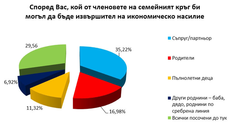 Според участвалите в анкетата, насилието е разпространено във всички форми на междуличностни отношения в семейството. С най-голям процент изследваните лица са посочили като вероятен извършител на икономическо домашно насилие съпругът или партньорът на жертвата – 35%. Интересни са данните, получени при лицата над 65 год. С най-голям процент, като възможни извършители на икономическо домашно насилие, хората на пенсионна възраст посочват два отговора с равен резултат, а именно „Съпруг/партньор” и „Пълнолетни деца” с по 36,36%, което е ясно доказателство за предаване на семеен модел – до определена възраст лицето е жертва на своя съпруг, а с напредването на възрастта на своите пълнолетни деца, приели поведението и взаимоотношенията за нормални.