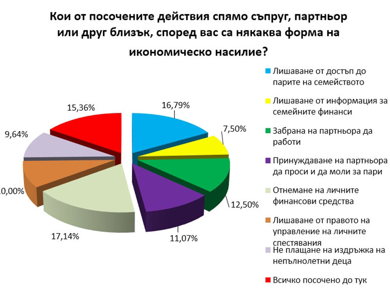Фокусирайки се върху икономическото насилие, данните от анкетата сочат, че най-значимо за участниците като негова проява е отнемането на личните финанси – 17% и лишаването до достъп до семейните финансови средства – 17%. Не малка част от запитаните отговарят, че форма на икономическо насилие е всичко изброено до тук – 15,36%. Малко под 9% посочват, че да не се плаща издръжка на непълнолетни деца е проявата, която не се възприема като някакъв вид икономическо насилие или финансова зависимост. Други действия, които не са добре разпознати, като форми на насилие са лишаването от информация за семейните финанси – 7,50% и лишаването от право на управление на личните средства – 10,00%.