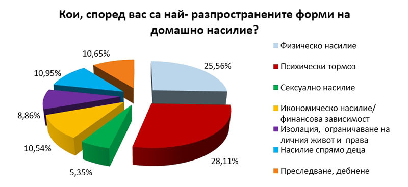 Като най-значими форми на домашно насилие анкетираните посочват психическия тормоз (28%) и физическото насилие (25%). Икономическото насилие / финансова зависимост, изолацията, проследяването и дебненето, както и насилието спрямо деца са поставени на първо място от по 10% от участниците в анкетата. 5% определят като най-страшно сексуалното насилие.