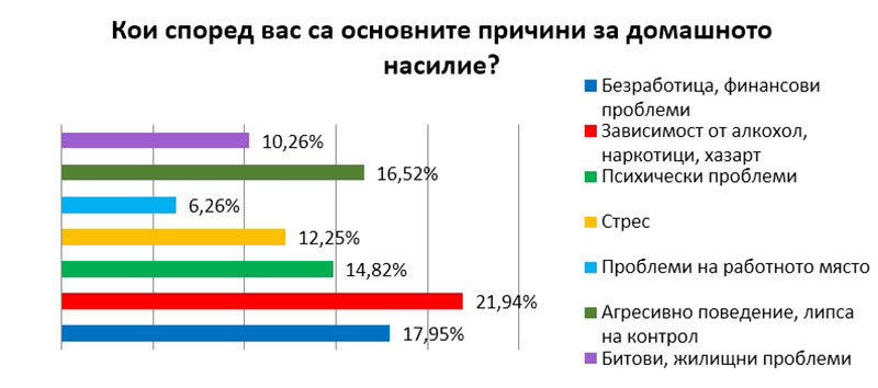 Причините, водещи до прояви на домашно насилие също са разнородни. Най-значима според 1/4 от анкетираните е някаква форма на зависимост – алкохол, хазарт, наркотици, а противно на очакваното, най-малко – 6% посочват, че проблеми с финансите и оставането без работа са причина за проява на насилие.