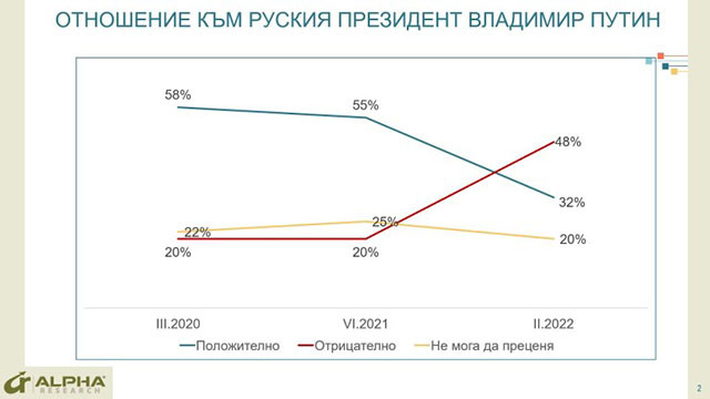 За четирите дни военни действия позитивният рейтинг на руски президент Владимир Путин губи над половината от своята популярност в страната. Ако през периода 2020 - 2022 г. между 55% и 58% от българите са изразявали положителни оценки за него, при само 20 на сто отрицателни, сега ситуацията радикално се обръща. Позитивните мнения намаляват почти двойно, до 32%, а отрицателните нарастват до 48%.