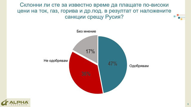 Хората си дават ясна сметка за тежките човешки, морални, икономически и социални последствия от разрушителната война, които ще се усещат все по-силно през следващите месеци. Склонни ли са в тази ситуация да заплатят за по-високите цени на тока и горивата, в резултат от войната и наложените санкции? 47% от анкетираните заявяват готовност солидарно да споделят за известно време част от цената от наложените санкции. 36% обаче, основно хора с по-ограничени материални възможности, не са склонни, или не биха могли да платят по-високите цени.
