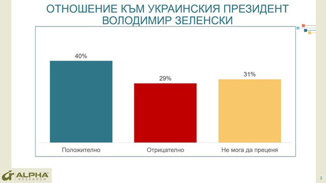 Войната в Украйна, с нейните жертви, страдания, разрушения и заложеното на карта бъдеще на Европа, променя драматично българското обществено мнение. В тези разломни дни, доскоро абсолютно непознатият президент на Украйна Володимир Зеленски печели симпатиите на 40% от анкетираните, 29% са с негативно мнение за него.