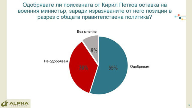 На този фон, 55% одобряват поисканата от министър-председателя Кирил Петков оставка на военния министър, заради изразяваните от него "лични" позиции по външната политика на страната. Цели 20% по-малко - 36% - не са съгласни със смяната на Стефан Янев. Доминиращото одобрение за оставката на военния министър се дължи основно на факта, че в критичната за света и България ситуация, когато Европа показва пълно единство, очакванията на мнозинството от гражданите са и в българското правителство да няма разнобой, а управляващите да действат единно и сплотено, тълкуват резултатите от "Алфа Рисърч".