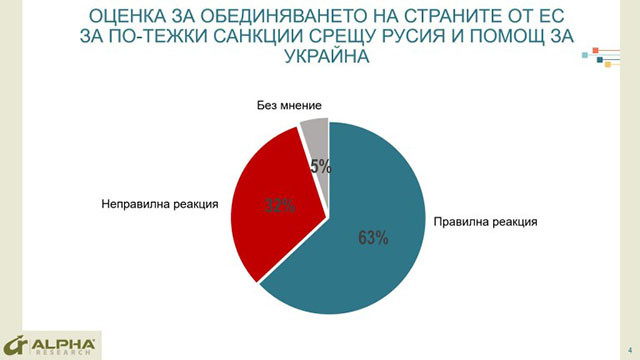 Като правилна политика от 63% от българите се оценява обединението на европейските страни в налагането на единни санкции срещу Русия и помощ за Украйна. На обратното мнение са 32 на сто.