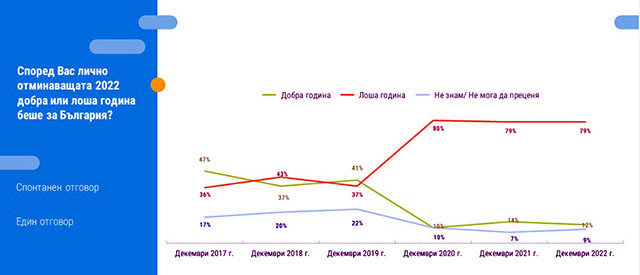 Едва 12% от българите оценяват 2022 г. като добра година за България, докато 79% - като лоша. Това показва проучване на изследователски център "Тренд", проведено между 1 и 8 декември сред 1005 пълнолетни българи.