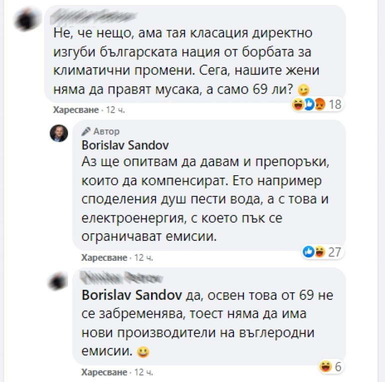 „Да, храната ни може да се измери в изразходвана вода и енергия, както и със своя въглероден отпечатък при нейното отглеждане, преработка, транспорт, съхранение и приготвяне. Не, българската мусака не е с най-голям въглероден отпечатък измежду популярни европейски ястия, независимо от направеното проучване на британски сайт. Най-малкото защото един класически телешки стек (белгийски например, или испански), съдържа много повече месо, което води до по-високо ниво емисии парникови газове на порция“, написа във Фейсбук профила си министърът на околната среда и водите Борислав Сандов.