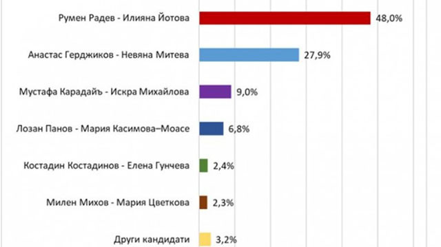 Сред твърдо решилите да гласуват за президент и избралите кого да подкрепят, кандидат-президентската двойка Румен Радев/Илияна Йотова получава 48,0%, а Анастас Герджиков /Невяна Митева – 27,9%. Трети са Мустафа Карадайъ и Искра Михайлова с 9,0%, а четвърти -. Лозан Панов и Мария Касимова-Моасе с 6,8%. Кандидат-президентската двойка на Възраждане Костадин Костадинов и Елена Гунчева получава 2,4%, а тази на ВМРО - Милен Михов и Мария Цветкова – 2,3%. 0,4% посочват, че ще гласуват с „Не подкрепям никого”, а общо 3,2% посочват, че ще гласуват за други кандидати.