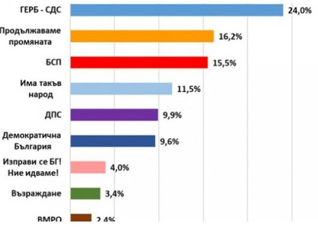 „Екзакта“: ГЕРБ остава първа политическа сила с 24%, второто място се оспорва между ПП и БСП