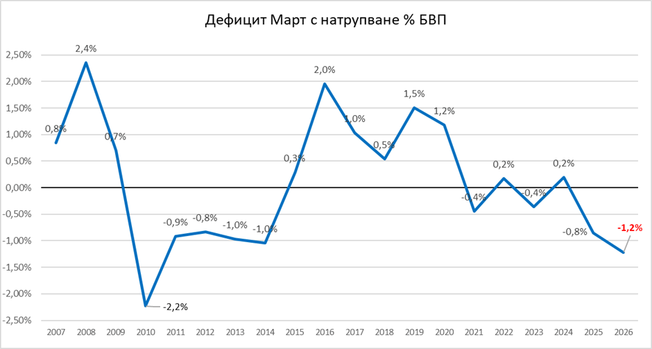 Дефицит за м. март с натрупване като процент от БВП