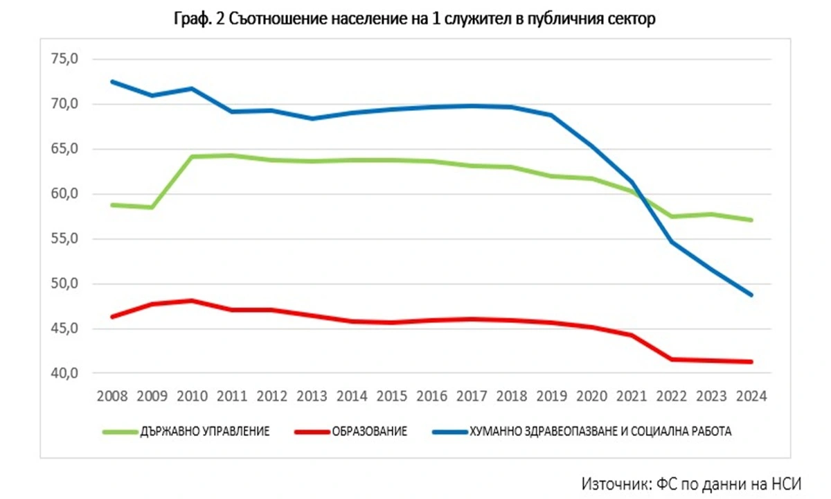 Заетите в обществения сектор по трудови и служебни правоотношения през 2024 г. са 558 399 души. Най-голям дял (около 28%) са заети в образователната сфера. На второ място по численост са заетите в сферата на здравеопазването (около 24%), а на трето място е държавната администрация с дял от около 20% (112,7 хил. д.). На тези три сектора се падат и приблизително 72% от общите разходи за заплати. Анализът на структурата на наетите лица в динамика показва значителен ръст в броя на заетите в здравния сектор – от 101 хил. д. през 2019 г. до 132 хил. д. през 2024 г. Този сектор отчита и най-голямото нарастване на разходите за заплати – от 1,7 млрд. лв. през 2020 г. до 3,4 млрд. лв. през 2024 г.