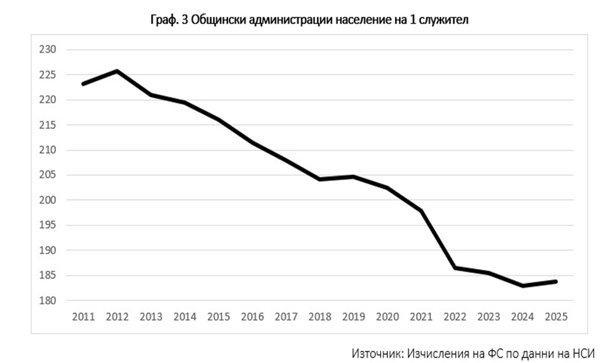 С изпреварващ ръст се отличават общинските администрации, които за периода 2011-2025 (юни) г. се увеличават с 2 184 души. При тях съотношението население на 1 служител по изчисление на ФС по данни на НСИ намалява от 223,2 през 2011 г. на 183,9 през юни 2025 г., т.е. налице е съществено увеличаване на административната тежест.