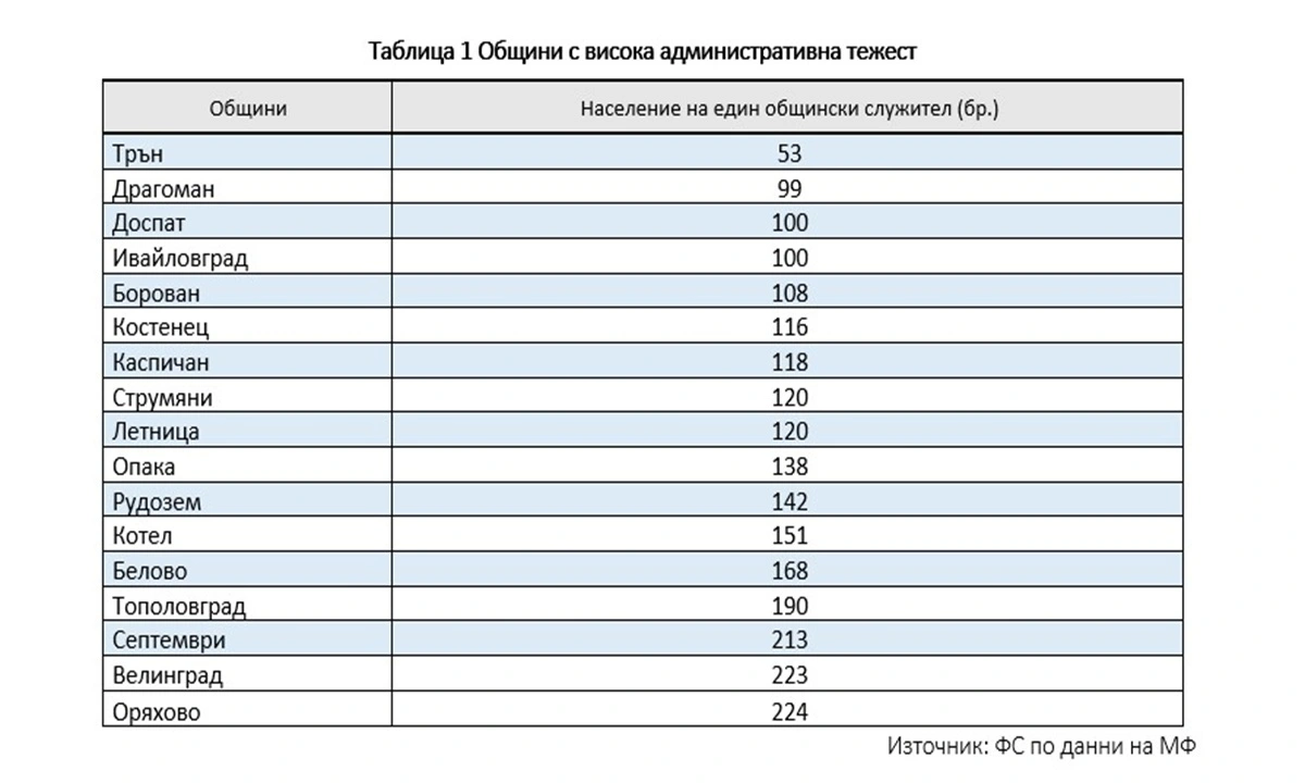 Следва да се обмисли административна реформа за намаляване на броя на общините. В много от по-малките общини административната тежест е твърде висока. Потвърждение на този факт са данните от МФ за юни 2025 г.