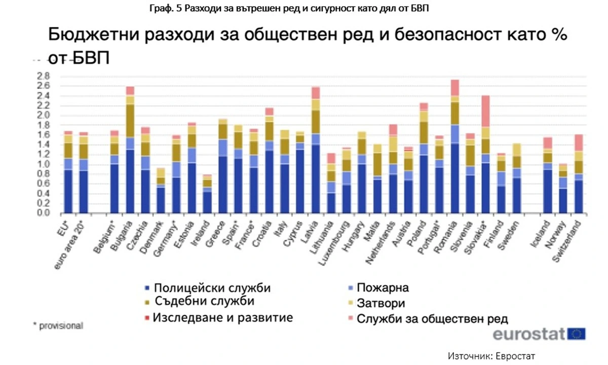 Разходите за вътрешен ред и сигурност в България като дял от БВП са едни от най-високите в ЕС – 2,6% при средно за ЕС и еврозоната 1,7% (Евростат, 2023 г.).