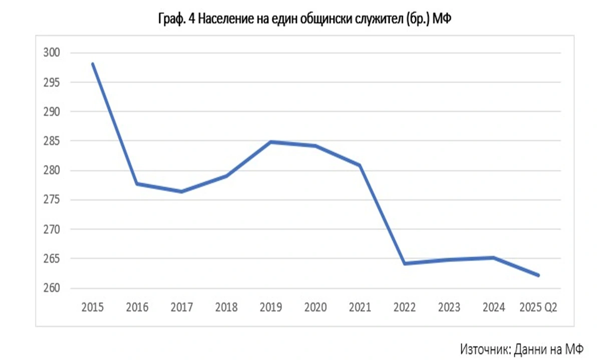 Този извод се потвърждава от данните за съотношението население на един общински служител (бр.) на Министерство на финансите за периода 2015-2025 юни. Дори ако приемем изчисленията на МФ за по-точни от тези на Фискалния съвет по данни на НСИ, тенденцията не се променя.