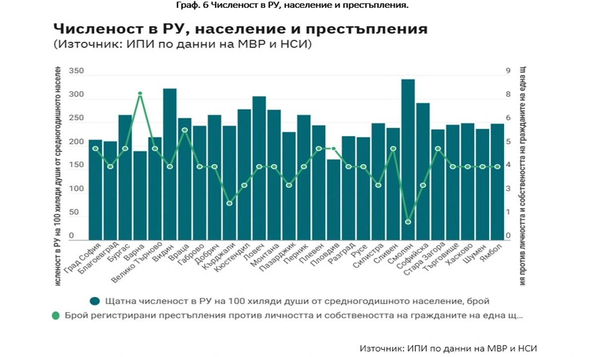 От графиката е видно, че е налице драстично несъответствие между численост и престъпления, което поражда потребности от оптимизиране на числения състав по области, особено наложително за Смолян, Кърджали, Варна, Пловдив и др.