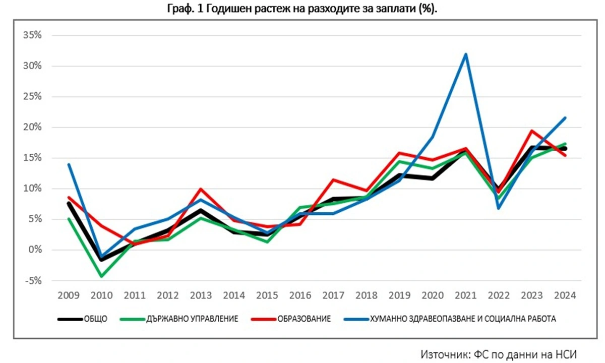 Средната брутна работна заплата в обществения сектор е 2 400 лв. през 2024 г., като се увеличава с 15% спрямо предходната година. С подобен темп нарастват заплатите в трите най-големи сектора. В графика 1 по-долу се вижда годишният растеж на разходите за заплати, сравнен с общия растеж на публичния сектор. Отново се потвърждава ускореният растеж на хуманното здравеопазване и социална работа, особено през годините на пандемията, но и през 2024 г. След него е отрасълът на образованието, докато държавното управление е с най-умерен растеж.