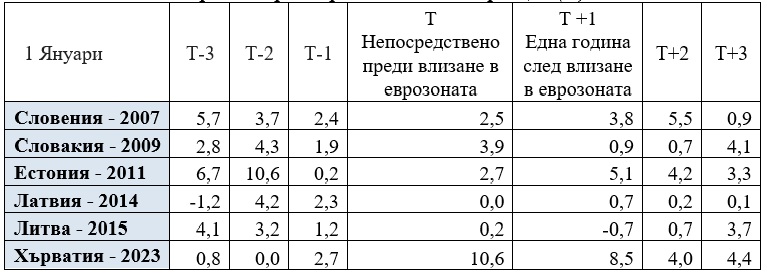 Данните представляват сравнение на хармонизираните средногодишни инфлационни ставки за няколко държави 3 години преди и 3 години след влизането им в еврозоната.