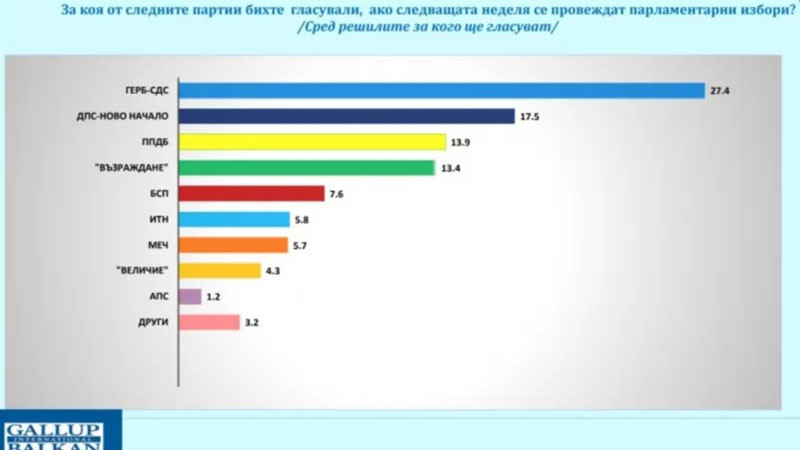 "Галъп": Ако гласуваме днес - ГЕРБ-СДС - 27,4%, ДПС-НОВО НАЧАЛО - 17,5%, ПП-ДБ - 13,9%