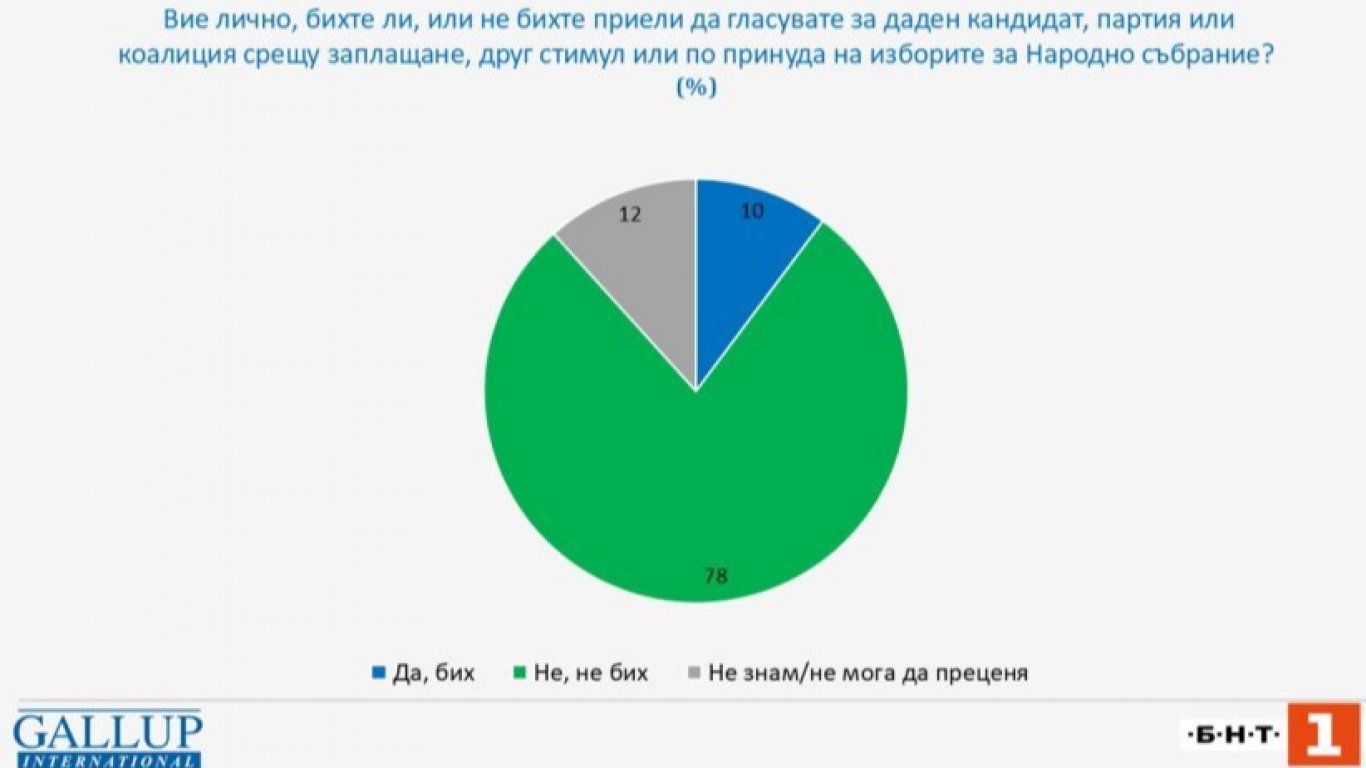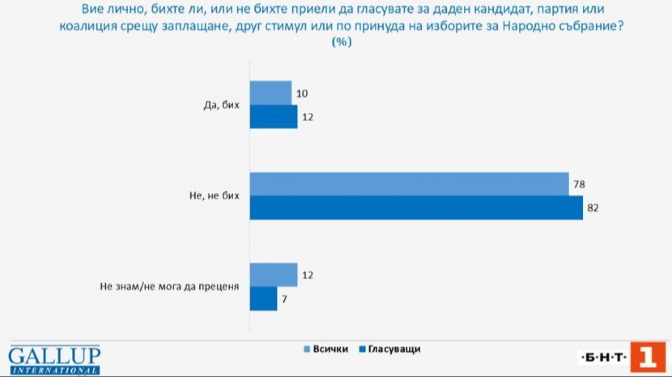 Запитани директно дали биха или не биха приели да гласуват срещу заплащане, друг стимул или принуда седмици преди вота, една десета от респондентите признават, 78% отричат, а още над една десета (12%) заявяват, че не могат да преценят. Данните, разбира се, са декларативни и искреността им би могла да се постави под въпрос, но дават основание за анализ върху дълбочината на проблема.