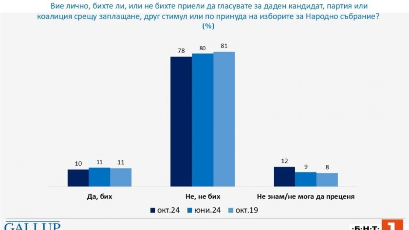 "Галъп интернешънъл болкан" проведе специално допитване за Българската национална телевизия, за да провери какви са нагласите към гласуването срещу стимул, заплащане или принуда. Изследването е проведено между 28 септември и 6 октомври 2024 г. сред 806 души по метода "лице в лице" с таблети.