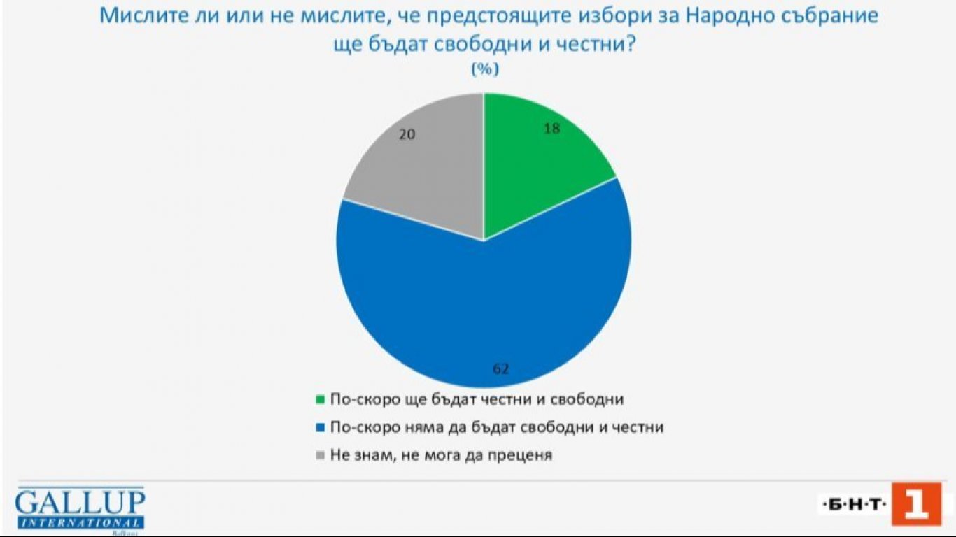 На този фон нагласите към честността на изборите са предимно негативни. Запитани дали мислят, че предстоящите избори за Народно събрание ще бъдат свободни и честни 62% от респондентите отговарят отрицателно, 18 на сто са оптимисти, а още 20% не могат да преценят. Картината изглежда пиково тревожна на фона на изследователската практика в последното десетилетие.